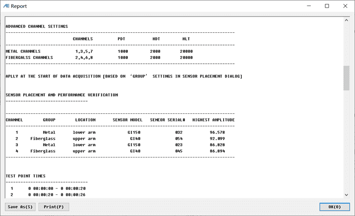 AE sensors collect AE signals from Aerial work platform, and transmit them to DAQ for analysis and processing, and then transmit the data to SWAE analysis software for further analysis and display. So that users can intuitively see the status of aerial work platform throughout the whole loading process. The SWAE (AWPT version) software is designed specially for aerial work platform purpose and follows ASTM F914-03 standard. By default, there are 8 views preloaded in the software for immediate operations: